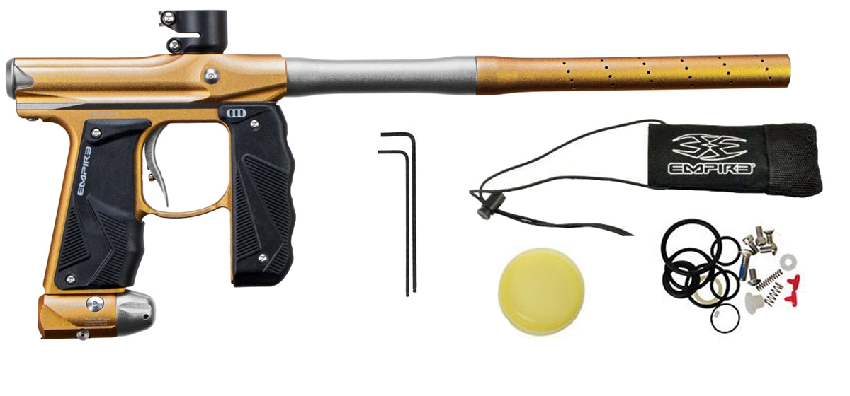 The Empire Mini GS Paintball marker now comes with a new two piece barrel. The Mini GS is the next generation of a paintball marker legend. The team at Empire has taken the proven Mini marker platform and designed and developed it to be even better. In addition to the battle proven Mini engine, the Empire Mini GS includes a full wrap-around rubber fore grip that creates a secure grip and protection from paint and the elements. The Mini GS also adds an On/Off ASA that eliminates any thread issues and makes for smooth removal of your tank. For an added bonus, the new design allows for a simple drop-in of the Redline OLED board without switching the fore grip. The ASA and fore grip attachment points have been beefed up for extra strength and superior performance. Of course you have all the regular goodies you have come to expect and depend on from the Empire Mini: Hose-less design, Anti Chop Break Beam Eyes, Clamping feedneck, and proven Mini performance. It takes a truly amazing product to follow a legend, and Empire hits the mark with the Mini GS.