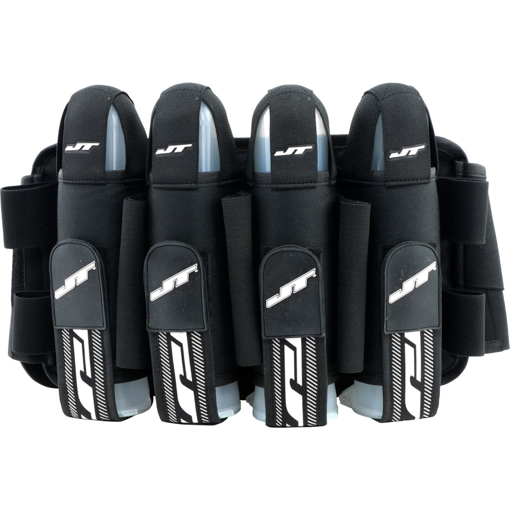 The JT Harness FX 4+7 features NXe harness technology. The four main pod compartments keep your pods securely in place with Velcro straps sporting the JT logo. Elastic push straps help eject the pods into your hand, making for faster reloads of your hopper. Seven additional elastic pod loops increase the carrying capacity of this harness to a total of 11 140 round pods. Your comfort is assured, even with a full load, by the padded lumbar comfort pad.