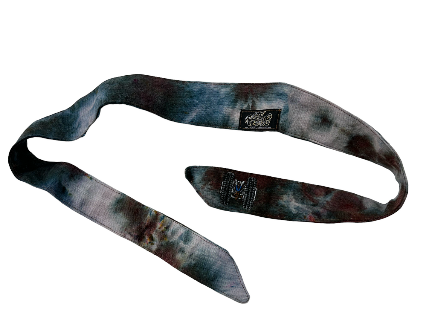 DEAD MAN'S HAND headband is hand dyed, sewn, and made in the USA. This band features our signature cloth and unique terry cloth. The embroidery signifies the band belongs to a collection. All bands are unique and will age with use. To ensure dye retention we recommend using Castile soap, cold water, and hang dry. Tag not selectable. 1:11