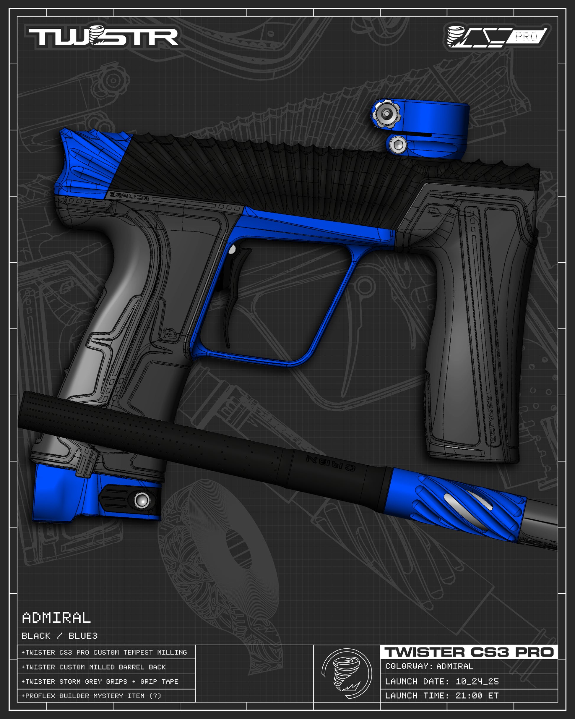 The TWSTR CS3 PRO Platform is embodiment of modern day custom, a true refinement of Planet Eclipse's the pro-proven flagship marker. Limited to only 300 TOTAL MARKERS in the First Wave of release spanning 140 stunning colorways making it the largest selection of any marker currently on the market. Featuring our new groundbreaking Tempest 3D Flow contoured “Clamshell” body-wrapped milling spanning the entire bespoke body from barrel to boltcap. Giving the marker an "SL" level of weight reducing while allowing for sculpted signature TWSTR milling, paired with exclusive color combos to add an aggressive and unique marker profile.