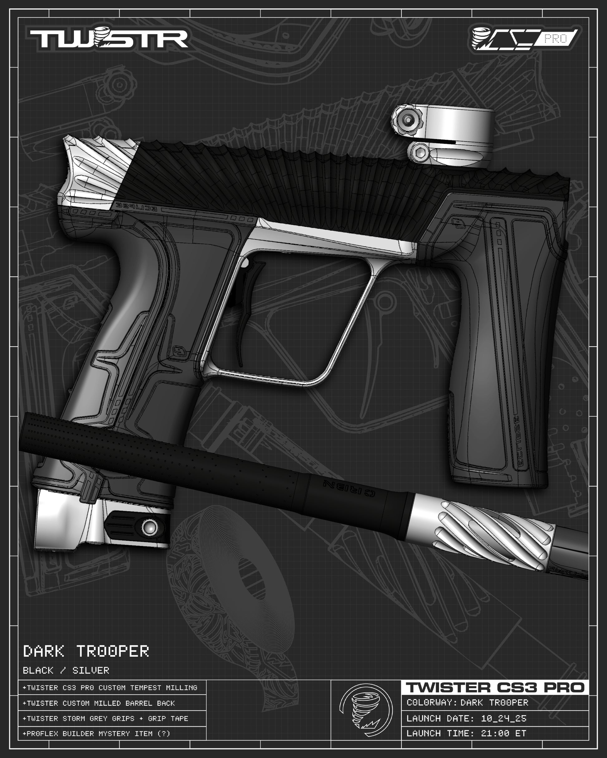 The TWSTR CS3 PRO Platform is embodiment of modern day custom, a true refinement of Planet Eclipse's the pro-proven flagship marker. Limited to only 300 TOTAL MARKERS in the First Wave of release spanning 140 stunning colorways making it the largest selection of any marker currently on the market. Featuring our new groundbreaking Tempest 3D Flow contoured “Clamshell” body-wrapped milling spanning the entire bespoke body from barrel to boltcap. Giving the marker an "SL" level of weight reducing while allowing for sculpted signature TWSTR milling, paired with exclusive color combos to add an aggressive and unique marker profile.