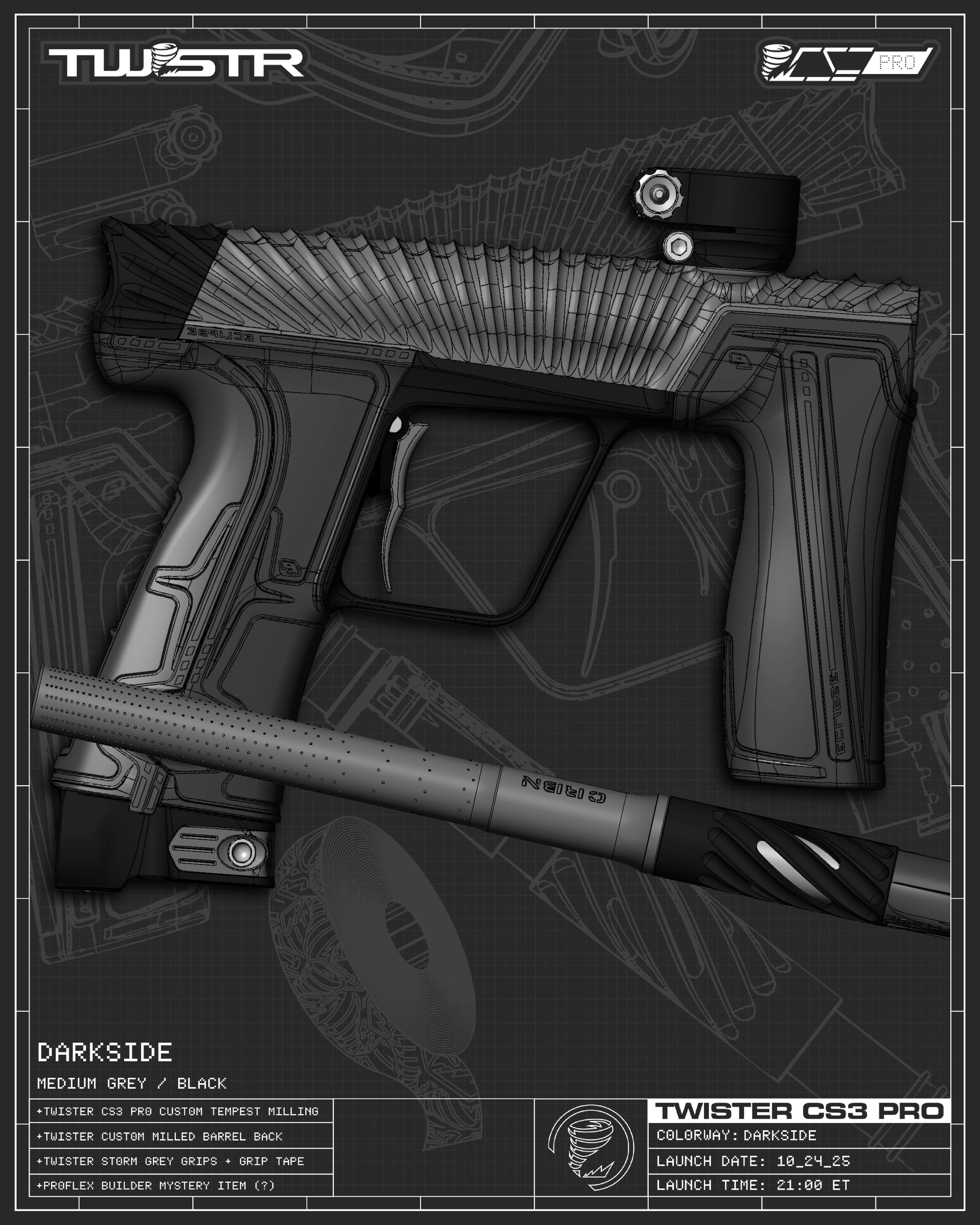 The TWSTR CS3 PRO Platform is embodiment of modern day custom, a true refinement of Planet Eclipse's the pro-proven flagship marker. Limited to only 300 TOTAL MARKERS in the First Wave of release spanning 140 stunning colorways making it the largest selection of any marker currently on the market. Featuring our new groundbreaking Tempest 3D Flow contoured “Clamshell” body-wrapped milling spanning the entire bespoke body from barrel to boltcap. Giving the marker an "SL" level of weight reducing while allowing for sculpted signature TWSTR milling, paired with exclusive color combos to add an aggressive and unique marker profile.