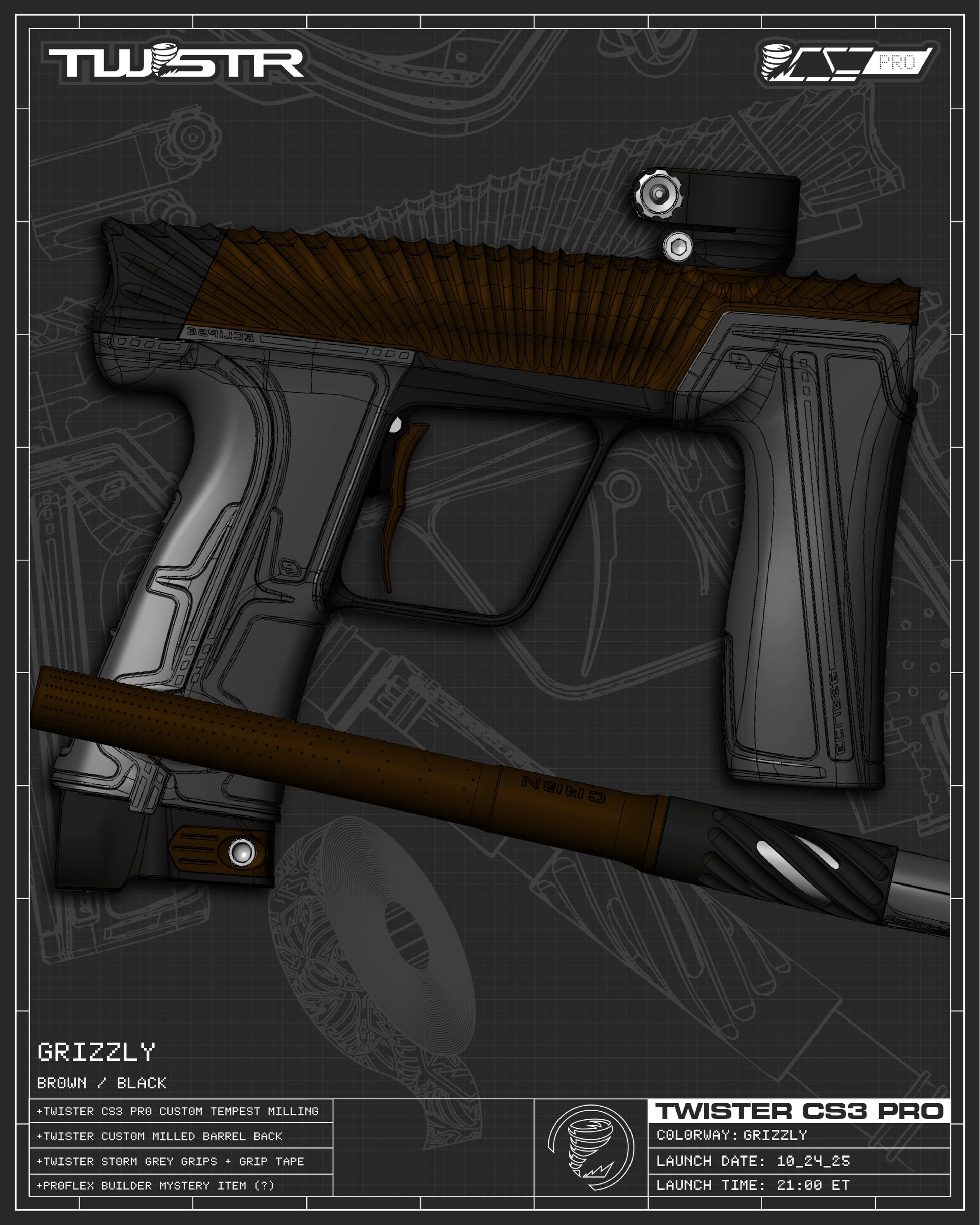 The TWSTR CS3 PRO Platform is embodiment of modern day custom, a true refinement of Planet Eclipse's the pro-proven flagship marker. Limited to only 300 TOTAL MARKERS in the First Wave of release spanning 140 stunning colorways making it the largest selection of any marker currently on the market. Featuring our new groundbreaking Tempest 3D Flow contoured “Clamshell” body-wrapped milling spanning the entire bespoke body from barrel to boltcap. Giving the marker an "SL" level of weight reducing while allowing for sculpted signature TWSTR milling, paired with exclusive color combos to add an aggressive and unique marker profile.