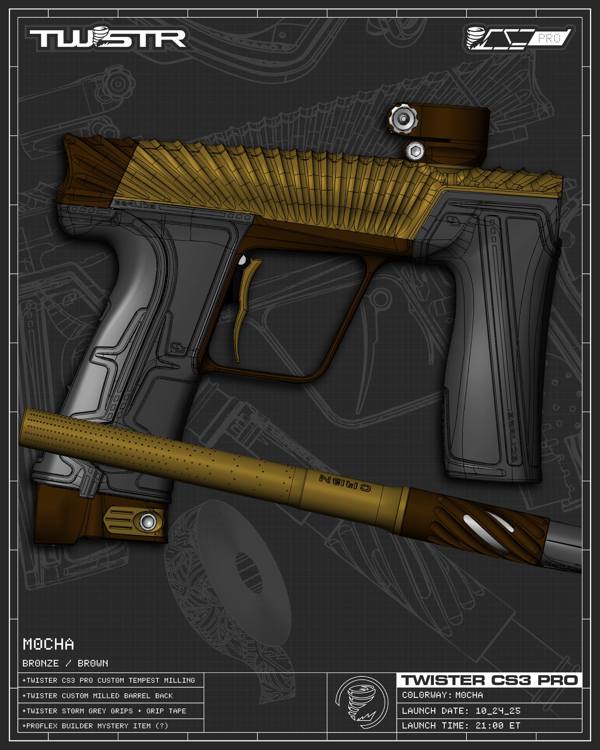 The TWSTR CS3 PRO Platform is embodiment of modern day custom, a true refinement of Planet Eclipse's the pro-proven flagship marker. Limited to only 300 TOTAL MARKERS in the First Wave of release spanning 140 stunning colorways making it the largest selection of any marker currently on the market. Featuring our new groundbreaking Tempest 3D Flow contoured “Clamshell” body-wrapped milling spanning the entire bespoke body from barrel to boltcap. Giving the marker an "SL" level of weight reducing while allowing for sculpted signature TWSTR milling, paired with exclusive color combos to add an aggressive and unique marker profile.