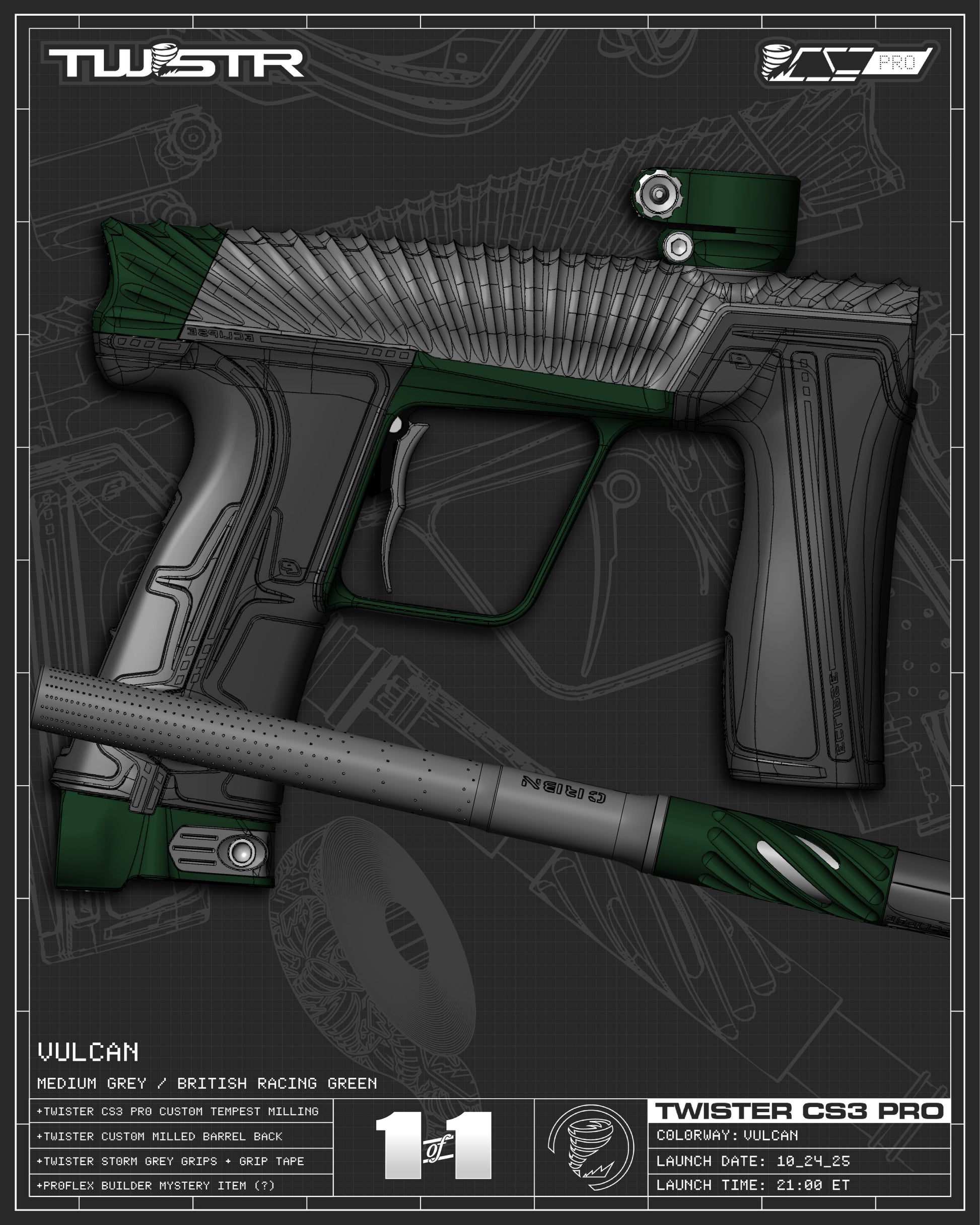 The TWSTR CS3 PRO Platform is embodiment of modern day custom, a true refinement of Planet Eclipse's the pro-proven flagship marker. Limited to only 300 TOTAL MARKERS in the First Wave of release spanning 140 stunning colorways making it the largest selection of any marker currently on the market. Featuring our new groundbreaking Tempest 3D Flow contoured “Clamshell” body-wrapped milling spanning the entire bespoke body from barrel to boltcap. Giving the marker an "SL" level of weight reducing while allowing for sculpted signature TWSTR milling, paired with exclusive color combos to add an aggressive and unique marker profile.