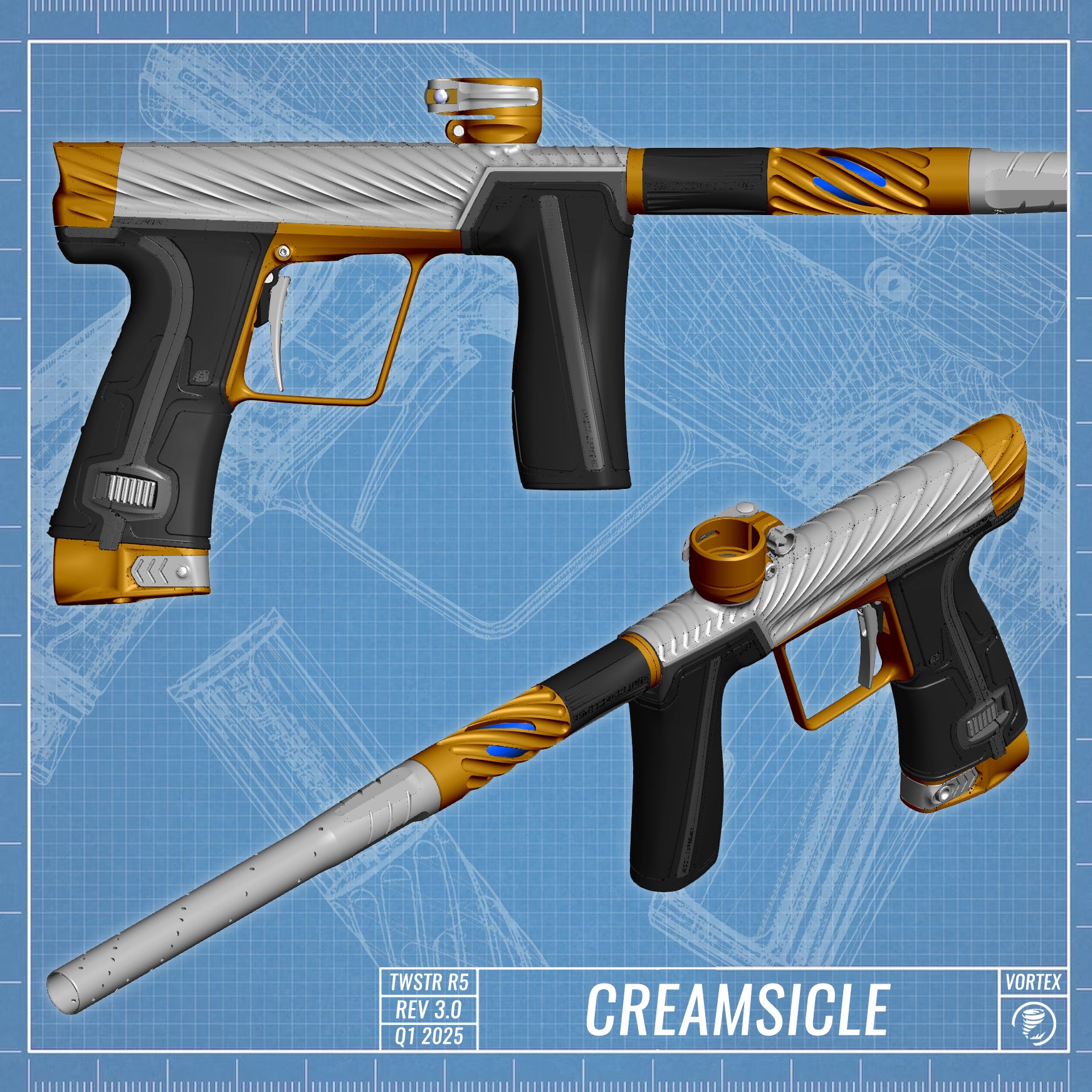 Forged through industry partnerships the TWSTR R5 will include exclusive accessories to enhace the look and performance of each marker. The addition of the TECHNA Forged Carbon Fiber Vortex Super-Blade trigger gives each player the ability to unlock the full performance potential through multi-plane and wider tactile trigger surface area. Additionally We have worked with Planet Eclipse to create the Vortex S63 Barrel back featuring widowed TWSTR milling to accent your marker and at a quick glance check your insert color and size.