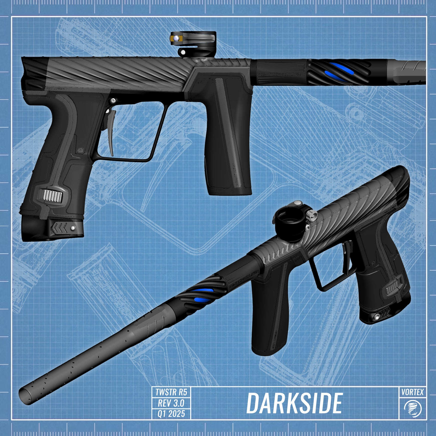 Forged through industry partnerships the TWSTR R5 will include exclusive accessories to enhace the look and performance of each marker. The addition of the TECHNA Forged Carbon Fiber Vortex Super-Blade trigger gives each player the ability to unlock the full performance potential through multi-plane and wider tactile trigger surface area. Additionally We have worked with Planet Eclipse to create the Vortex S63 Barrel back featuring widowed TWSTR milling to accent your marker and at a quick glance check your insert color and size.