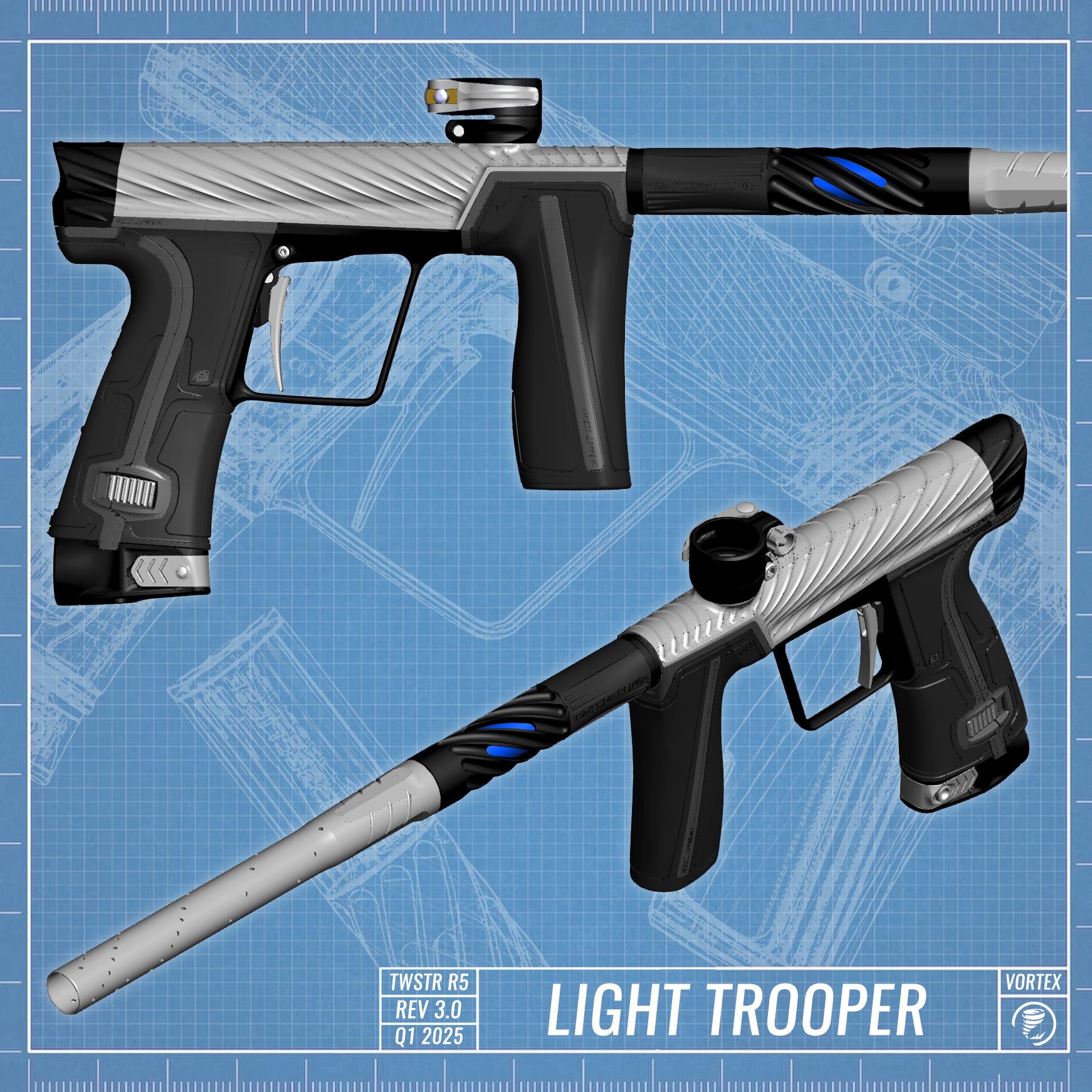 Forged through industry partnerships the TWSTR R5 will include exclusive accessories to enhace the look and performance of each marker. The addition of the TECHNA Forged Carbon Fiber Vortex Super-Blade trigger gives each player the ability to unlock the full performance potential through multi-plane and wider tactile trigger surface area. Additionally We have worked with Planet Eclipse to create the Vortex S63 Barrel back featuring widowed TWSTR milling to accent your marker and at a quick glance check your insert color and size.