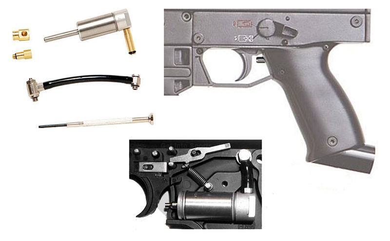 Utilizing patented technology for up to 15 balls per second air-assisted firing, the Response Trigger System increases your trigger speed by resetting the trigger and sear with excess gas during firing. This gas is used to operate a cylinder behind the trigger to do the resetting. The pressure of your finger on the trigger pulls it back to fire the next shot. The speed is determined by the amount of flow through the knurled adjuster on the side. The upper limit on the rate of fire is set by this adjuster.
